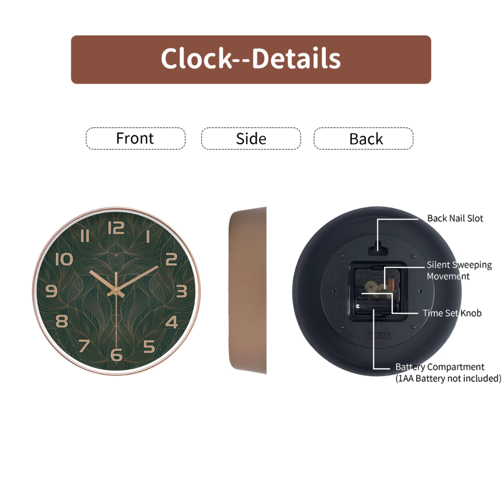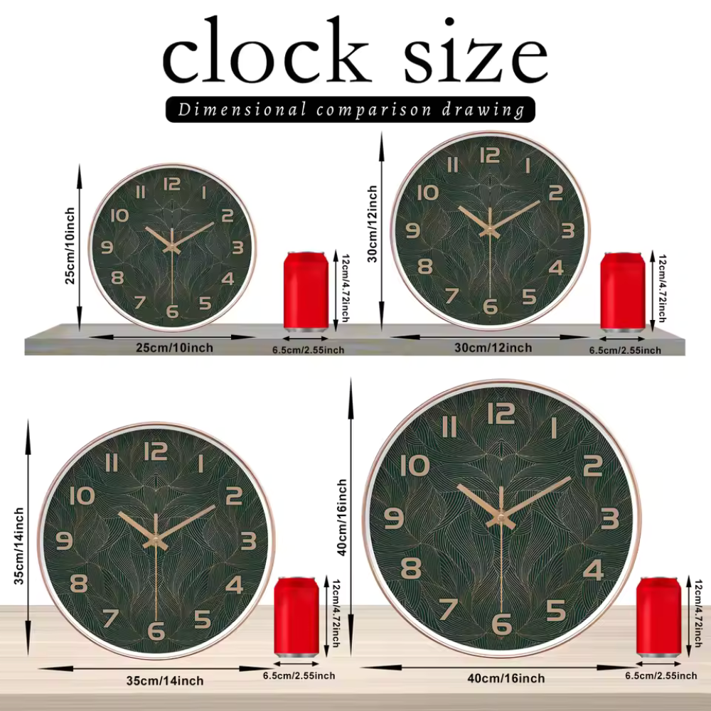 Groene Blad Wandklok Rond Stil Ontwerp met Gouden Accenten